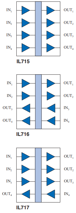 The IL715, IL716, and IL717 are available in 16-pin 0.3" and 0.15" SOIC, and ultraminiature QSOP packages. V-Series versions have an extremely high isolation voltage of 7 kVRMS. “T” and “V” Series parts have a maximum operating temperature of 125 °C.